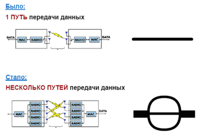 - применение нескольких приемопередатчиков и специальных алгоритмов передачи и приема радиосигнала, известный по аббревиатуре MIMO;