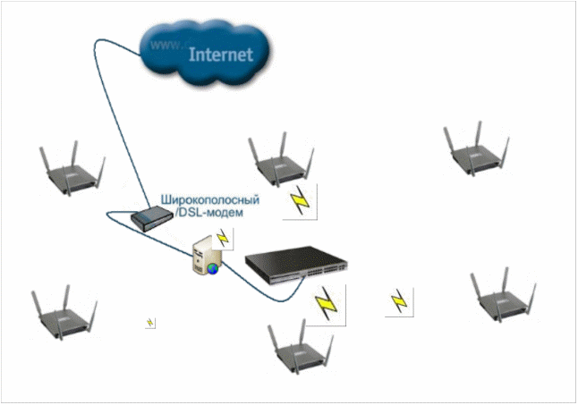 Сеть будет управляться сервером с помощью беспроводного коммутатора. Так как беспроводной коммутатор и точки доступа распространяют сигнал сферически, планируется установить по три точки доступа на втором и четвёртом этажах по всей площади общежития, а беспроводной коммутатор - на третьем этаже, в центре, для охвата каждой точки доступа. Схема беспроводной сети представлена на рисунке 2.4
