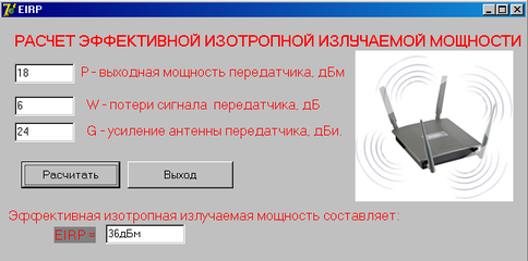 При проектировании беспроводной сети Wi-Fi была разработана программа расчёта эффективной изотропной излучаемой мощности для удобства проведения расчетов. Приложение разработано на языке Delphi 7