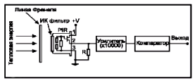 Для детектирования ИК излучения применяют пироэлектрические датчики. Их создают на основе специального кристаллического материала, способного при воздействии на него ИК излучения вырабатывать поверхностный электрический заряд. Этот заряд усиливается встроенным в ИК датчик усилителем на полевом транзисторе, обеспечивающим формирование управляющего напряжения. Поскольку датчик реагирует на ИК излучение в широком диапазоне, для сужения последнего применяется специальный фильтр, ограничивающий восприятие датчиком ИК излучения только в диапазоне от 8 до 14 мкм.