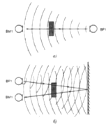 Данный способ обнаружения подвижных объектов обеспечивает очень высокую чувствительность при высокой экономичности, поскольку волна от излучателя BF1 к приемнику ВМ1 проходит через помещение по наиболее короткому пути, а следовательно имеет наименьшее затухание.