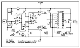 В схеме детектора перемещений используется дешевый счетверенный операционный усилитель 1М324. Первые два ОУ-1С1А, 1С1В - выполняют функции усилителя, два другие - функции компаратора. Выпрямленный диодами 03, 04 сигнал поступает на одновибратор 1С2, который управляет транзисторным ключом 01. В цепь коллектора транзистора 01 включена обмотка исполнительного реле.