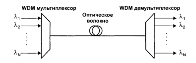 Рисунок 1.1 Схема оптического сегмента, использующего передачу мультиплексного сигнала по волокну.