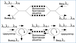 В мультиплексорах ввода/вывода каналов волоконная брэгговская решетка может использоваться вместе с двумя циркуляторами, редко используются в пассивных компонентах систем DWDM сами по себе. Со стороны порта вывода канала циркулятор выделяет отраженную волну и направляет ее в порт вывода (рис. 2.4, слева). Со стороны порта ввода циркулятор добавляет в передаваемый составной сигнал один канал на той же длине волны, что была выделена (рис. 2.4, справа). Такие устройства часто используются на границе между магистральным каналом и сетью городского или регионального масштаба. В магистральном канале обычно очень много длин волн, в то время как в городских или региональных сетях их намного меньше.