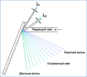 Представим, что в падающем свете присутствует излучение разных длин волн. Можно выбрать угол падения таким образом, что волны определенной длины при отражении от отдельных линий решетки будут отличаться по фазе друг от друга ровно на одну длину волны. В этом случае все отраженные волны будут усиливать друг друга. Такой угол будет углом максимального пропускания для заданной длины волны падающего света.