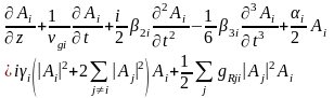 Здесь Ai - модуль комплексной амплитуды сигнала i-го канала, gi - групповая скорость, 2i - коэффициент дисперсии второго порядка, 3i - коэффициент дисперсии третьего порядка, i - коэффициент поглощения, gRji - коэффициент усиления Рамана в i-м канале, вызванного j-м каналом, i - параметр нелинейности волокна (i=2n2/iAeff), где n2 - коэффициент нелинейности, а Aeff - эффективное поперечное сечение волокна.