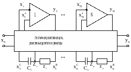 В общем случае произвольное по своему функциональному назначению и структуре ARC-устройство можно рассматривать в виде совокупности N дифференциальных операционных усилителей и n RC-цепей первого порядка, связанных между собой посредством коммутатора, в состав которого могут входить только резистивные делители и сумматоры (рис. 3).
