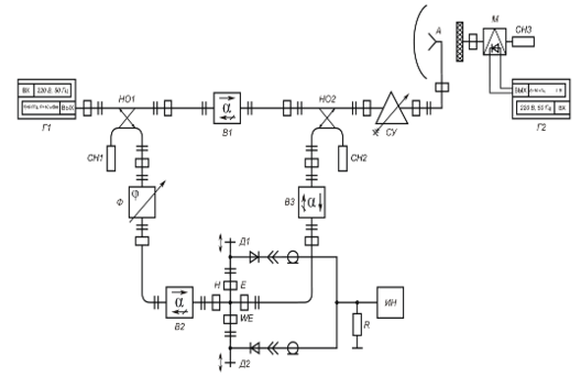 На рисунке 6.1 представлена структурная схема устройства, предназначенного для контроля электрической толщины радиопрозрачных диэлектрических стенок методом свободного пространства на отражение с использованием модулирующего отражателя. На схеме присутствуют следующие элементы: