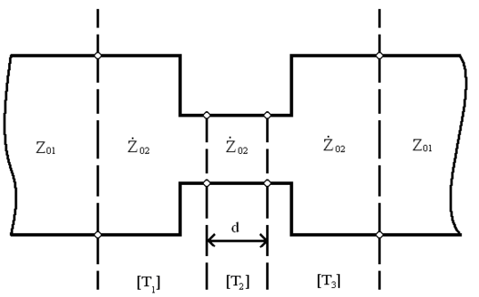 Комплексные коэффициенты отражения и прохождения могут быть найдены при этом волновой матрицы передачи эквивалентного четырехполюсника, образованного двумя скачками волновых сопротивлений (Z02) и отрезком линии с потерями (Ż02). При выводе этих выражений необходимо произвести замену параметров ε и tgδ на n (коэффициент преломления) и k (коэффициент поглощения), причем связь между ними определяется соотношением