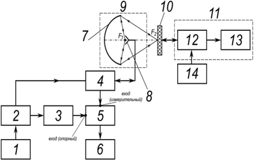 Исследуемый сигнал поступает к приемопередающей антенне 9, а именно на ее облучатель 8, излучается в виде электромагнитной волны в свободное пространство, которая падает и отражается эллипсоидным отражателем 7, затем собирается в узкий волновой пучок луч в районе второго фокуса эллипсоидного отражателя 7. Волновой пучок проходит через контролируемый диэлектрический образец 10 и отражается модулирующим отражателем 11. Фазовая модуляция отраженной электромагнитной волны осуществляется с помощью металлической диафрагмы и модулирующего диода 12, встроенных в волновод, и поглотителя (согласованной нагрузки) 13. Модулирующий диод питается от импульсного генератора 14.
