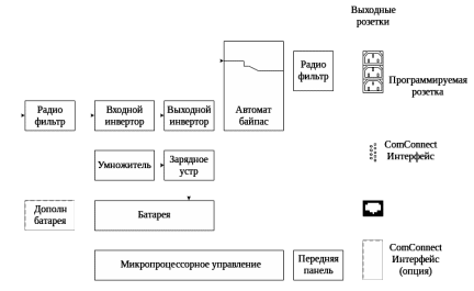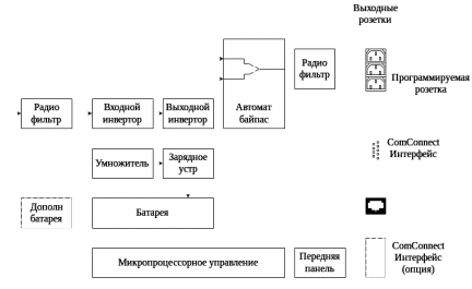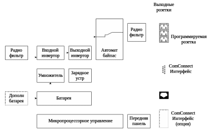 ИБП серии 19" NetPro имеет резервные источники электроэнергии в виде аккумуляторных батарей (далее просто «батарей»), расположенных в его корпусе. Это позволяет ИБП питать нагрузку, даже если напряжение электросети на входе полностью отсутствует. Электроэнергия батарей может быть получена только в форме постоянного тока, тогда как на входе и на выходе ИБП она существует в виде переменного тока синусоидальной формы. Поэтому ИБП имеет входной инвертор (преобразование переменного тока в постоянный) и выходной инвертор (преобразование постоянного тока в переменный) (рисунок 9.1).