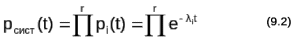 Оценим надежность некоторой сложной системы, состоящей из множества разнотипных элементов. Пусть p1(t), p2(t),…, pr(t)- вероятности безотказной работы каждого элемента на интервале времени 0...t , r - количество элементов в системе. Если отказы отдельных элементов происходят независимо, а отказ хотя бы одного элемента ведет к отказу всей системы (такой вид соединения элементов в теории надежности называется последовательным), то вероятность безотказной работы системы в целом равна произведению вероятностей безотказной работы отдельных ее элементов
