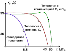 Важной составляющей успешного решения задачи является также минимизация входной емкости усилительного каскада, являющегося либо входным, либо промежуточным. Именно поэтому в структуре этого четырехполюсника необходимо обеспечить относительно низкое сопротивление нагрузки в коллекторной цепи или при использовании полевых транзисторов в цепи стока. Пример реализации каскада с компенсацией приведен на рис. 5.