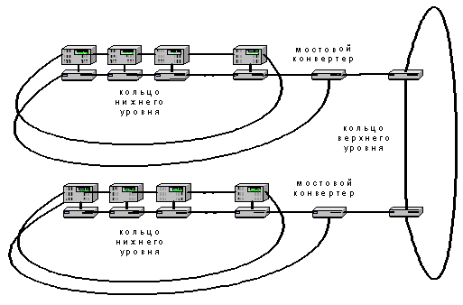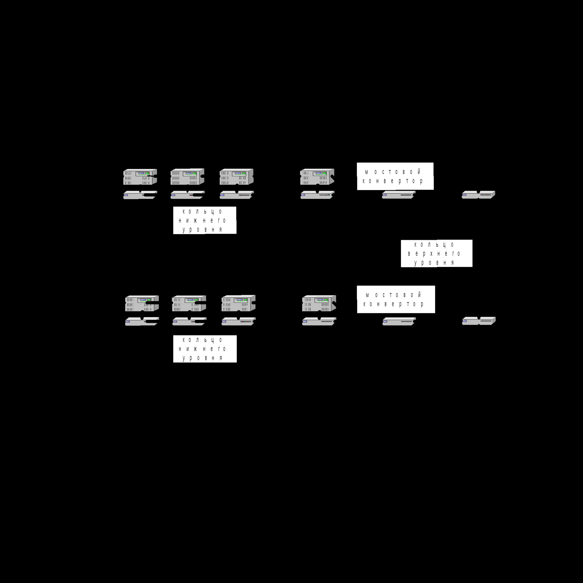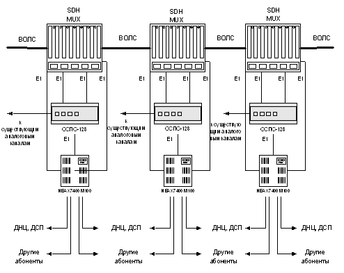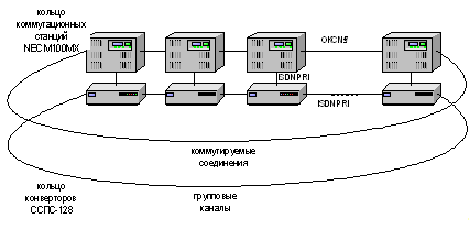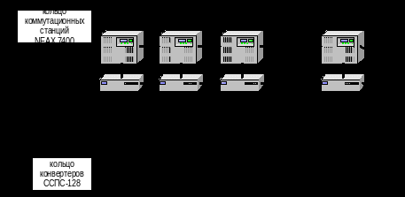 Логическая структура сети (рисунок 1.3) образована двумя кольцами: конвертеров ССПС-128 соединенных каналами ISDN PRI и станций NEАХ 7400 соединенных каналами ОКС№7 между собой. При этом ССПС-128 и NEАХ 7400 соединяются на одной станции. Отдельные кольца объединяются между собой как показано на (рисунке 1.4), с использованием мостового конвертера.