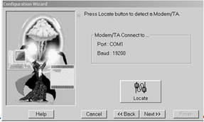 В появившемся меню выбрать «Modem connect» (модемное соединение) и нажать «Next» (рисунок 6.5), затем нажать «Locate» (рисунок 6.6). После идентификации модема (рисунок 6.7) нажать «Уеs».