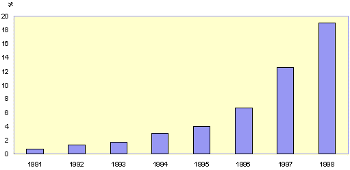 По оценкам, в России в 1997 г. на продвижение товаров было затрачено около 2 млрд. долл. Доля директ-маркетинга составила около 250 млн. долл., или 8%. Это не так уж и много. Зато наметилась устойчивая тенденция почти двукратного ежегодного роста доли директ-маркетинга в рекламных бюджетах. В 1996 г. сумма этих затрат оценивалась в 75 млн. долл. Если дело пойдет и дальше такими или близкими темпами, то к 2000 г. мы вполне способны сравняться с Европой по доле директ-маркетинга в расходах, связанных с продвижением товара (диаграмма 1).
