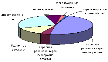 На адресную рассылку корреспонденции (писем, посылок и пр., отправляемых через почтовую сеть) приходится около 47%, адресная рассылка через курьерские службы составляет 4%, все виды безличных рассылок, включая раскладывание по почтовым ящикам и все виды раздач материалов или образцов, а также экспедирование по существующим карточным подписным схемам, – 13, директ респонс, включая телемагазины и купонные объявления в прессе, – 26, телемаркетинг – 7, факс-модемная рассылка – около 2, директ-маркетинг в сети Internet – менее 1% (диаграмма 5).