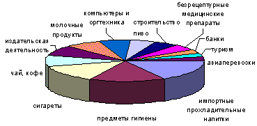 А что мы имеем сегодня? Пальму первенства удерживают прохладительные напитки импортного производства. Их доля – более 16%. Далее позиции распределились следующим образом: предметы гигиены – 15%, сигареты – 13, чай и кофе (в том числе российские производители) – 8, издательская деятельность – 8 (более половины из них – отечественные бизнесмены), молочные продукты – 7, компьютеры и оргтехника – 6, пиво – 5, строительство, производство стройматериалов и продажа жилья – 5, безрецептурные медицинские препараты – 4, банки (только отечественные, причем их активность заметно снизилась) – 3, туризм – 3, авиаперевозки – 3% (диаграмма 6).