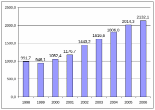 Анализ данных, приведённых на рис. 1.1. показывает, что после спада производства в период кризиса 1998-1999 г. внутренний рынок колбасных изделий развивается достаточно интенсивно. С 2000 г. ежегодно растёт объём производства (в 2006 г. в 2 раза к уровню 2000 г. и прирост 58% к уровню 2005 г.).