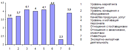 Как показывает рисунок наиболее проблемные области: инвестиции, уровень маркетинга продукции и уровень оснащения и оборудования, экспортно-импортная деятельность, то есть то, что требует наибольших финансовых затрат.