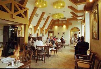 а стенах зала ресторана развешаны исторические фотографии начала прошлого века. Вот только удостовериться, что на них изображены Ленин или Брежнев, не получится: известные персонажи «награждены» мышиными мордашками. Во втором зале можно ознакомиться с портретами мышиного семейства.Массивные деревянные балки, выкрашенные в коричневый цвет, хорошо сочетаются с темной каменной плиткой, которой выложен пол и, частично (в качестве декоративного вкрапления), стены.