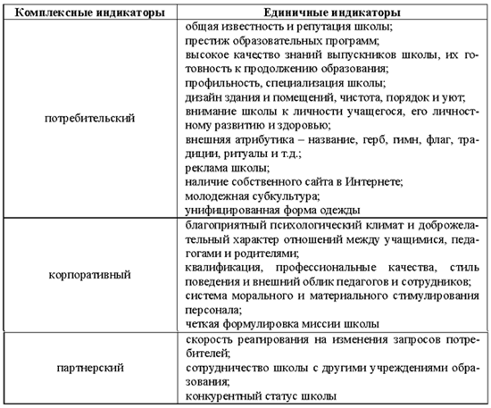 Также к основным характеристикам имиджа образовательного учреждения относят, в первую очередь, образ руководителя (его способности, установки, ценности социально-психологические характеристики, внешний вид), затем образ персонала образовательного учреждения (социальные данные, культура, профессиональная компетентность, личностные характеристики и т.д.), кроме этого, уделяется внимание представлению социального окружения о качестве образования, стиле школы, уровне комфортности школьной среды, цене образовательных услуг и внешней атрибутике.