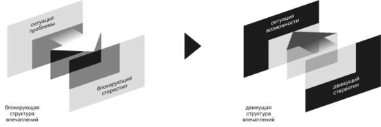 Наличие схемы позволяет проектировщику составить полное представление и последовательно активировать всю структуру потребностей, переключающих сознание субъекта с восприятия окружающего мира как проблемы на восприятие с точки зрения возможностей. Здесь показан также и переход от внешней конгруэнтности к внутренней.