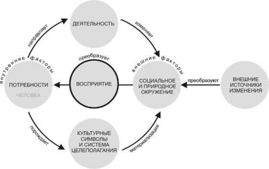 Читать эту модель следует так: человек организует свою деятельность в соответствии с потребностями. Деятельность, в свою очередь, ведет к изменениям то социальной, то природной среды, то обеих сразу. Изменение окружающей среды затем воздействует на восприятие реальности и, соответственно, ведет к изменению потребностей. Потребности рассматриваются как источник целеполагания, которое может быть спроецировано на реальность и способствовать ее пониманию. Материализация целей в отношении окружающей среды по-своему преобразует ее воздействие на потребности и т.д. Система не замкнута на себя. Она открыта внешнему воздействию, что предполагает изменение окружающей среды и, таким образом, всей системы в целом.