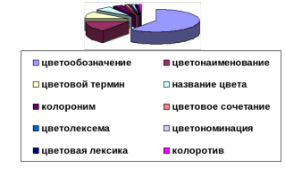 Основную массу употребляемых в работах ученых терминов составляют термины «цветообозначение» и «слово-цветообозначение» как синоним, далее «цветонаименование», остальные термины являются терминами-заменителями. Это можно представить в следующей схеме: