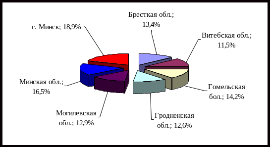Рис.3.1. Структура реализованной продукции в разрезе регионов ИЧТУП «Сибирский Берег-Белоруссия» в 2007 г.