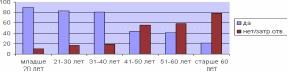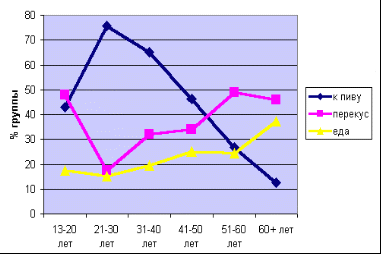 В ходе опроса обнаружилась еще и сильная зависимость ситуаций употребления кириешек от социально-демографических характеристик опрошенных (рис.3.3.). Например - от возраста. Так, для молодежи до 20 лет и для пожилых лиц старше 50 лет кириешки в первую очередь – средство «перекусывания», для потребителей старше 60 лет кириешки почти также часто служат едой. К пиву сухарики потребляют главным образом люди в возрасте от 20 до 40 лет.