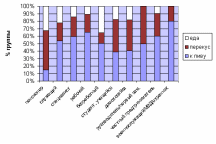 Что касается зависимости ситуаций употребления кириешек от социального статуса опрошенных, то здесь можно отметить, что к пиву этот продукт чаще употребляют рабочие, предприниматели, служащие (рис.3.4.). Реже – пенсионеры. Как к способу «перекусить», к кириешкам чаще прибегают руководители, пенсионеры, домохозяйки, студенты и учащиеся. Реже – безработные. В качестве «еды» кириешки чаще используют безработные и пенсионеры.