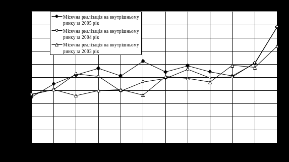 Рис.3.4 Помісячна динаміка обсягів реалізації горілчаної продукції ДП "УГК NEMIROFF" у 2003 - 2005 роках на внутрішній ринок