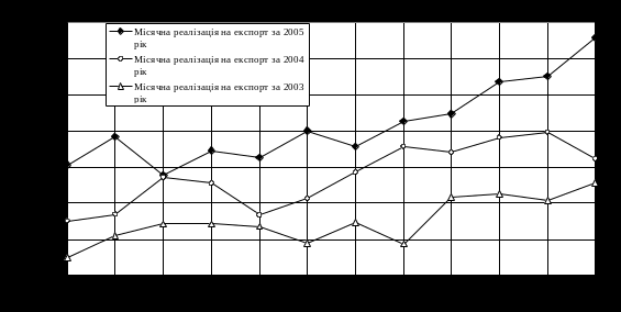 Рис.3.5 Помісячна динаміка обсягів реалізації горілчаної продукції ДП "УГК NEMIROFF" у 2003 - 2005 роках на експорт