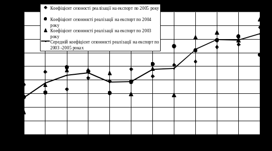 Рис.3.7. Коефіцієнт сезонності динаміки обсягів реалізації горілчаної продукції ДП "УГК NEMIROFF" у 2003 - 2005 роках на експорт відносно середньорічного місячного обсягу реалізації (експериментальна функція планування сезонності реалізації)