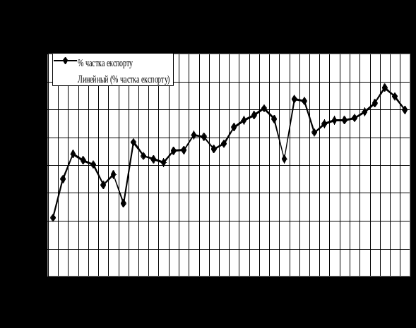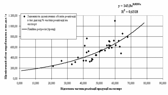 1. За 2003 - 2005 рік частка експорту в реалізованій продукції підвищилась з 30% (2003) до 65% (2005), при цьому лінійна регресія добре описує процес зростання експортної частки (коефіцієнт детермінації вище 0,7);