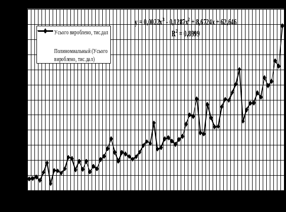 Рис.3.3 Динаміка загального виробництва горілчаної продукції ДП "УГК NEMIROFF" у 2003 - 2005 роках (фактичні дані та регресійний аналіз)