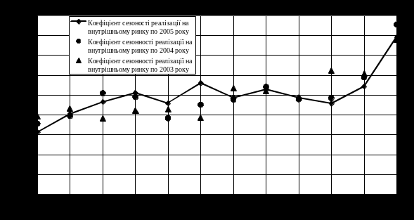 Рис.3.6. Коефіцієнт сезонності динаміки обсягів реалізації горілчаної продукції ДП "УГК NEMIROFF" у 2003 - 2005 роках на внутрішній ринок відносно середньорічного місячного обсягу реалізації