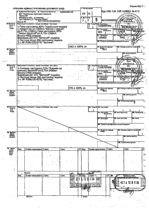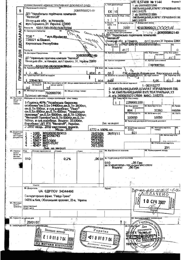 Наказом ДМСУ від 29.12.2004 № 929 “Перелік підприємств, які можуть бути задіяні в проведенні експерименту з використання електронної форми митного декларування” по ПОДІЛЬСЬКІЙ РЕГІОНАЛЬНІЙ МИТНИЦІ задіяно - 30805594 ДП “УКРАЇНСЬКА ГОРІЛЧАНА КОМПАНІЯ “NEMIROFF" [55].