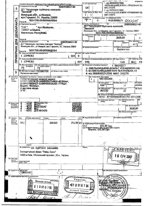 На рис.2.2 - 2.7 наведені приклад оформлення експортної ВМД при експорті горілчаної продукції в США, Італію морським транспортом (з доставкою контейнерів до морського порту по Україні митним перевізником), в Киргизстан - залізничним транспортом та Казахстан автомобільним транспортом. На рис.2.8 наведений приклад оформлення ВМД на повернення наданих імпортером у Киргизстані акцизних марок Киргизстана.