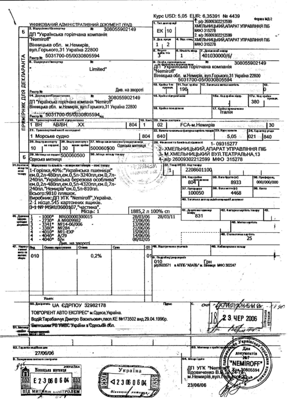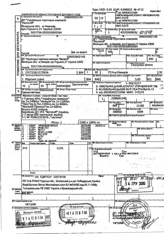Рис.2.4 Приклад оформлення експортної ВМД при експорті горілчаної продукції в США морським транспортом (з доставкою контейнерів до морського порту по Україні митним перевізником)