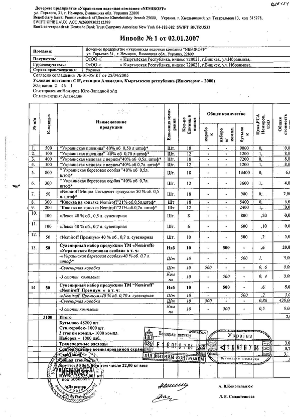 Рис.2.7 Приклад оформлення інвойса до експортної ВМД при експорті горілчаної продукції в Киргизстан залізничним транспортом (митним перевізником)