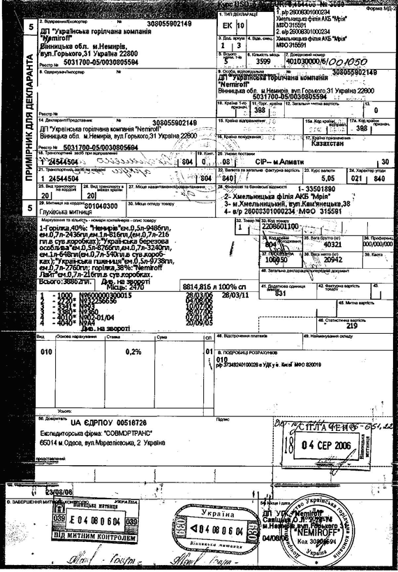 Рис.2.5 Приклад оформлення експортної ВМД при експорті горілчаної продукції в Казахстан автомобільним транспортом (митним перевізником)