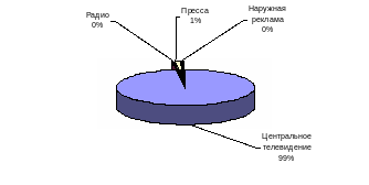 На рисунке представлена структура расходов на рекламу на основе данных о рекламных компаниях 50 наиболее рекламируемых в России медицинских препаратов. Как показал анализ рекламных кампаний, основная доля расходов приходится на рекламу по центральному телевидению. Данная структура расходов не является окончательной для препарата Полисорб и будет уточняться в ходе реализации проекта, по мере консультаций со специалистами по рекламе.