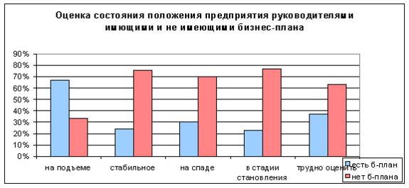 Более того, выявлена связь между оценкой руководителя состояния собственного предприятия и наличия в его фирме бизнес-плана. Состояние предприятия оценивалось по критериям: “на подъеме”, “нормальное, стабильное, без изменений”, “на спаде”, “в стадии становления”, “трудно оценить”.