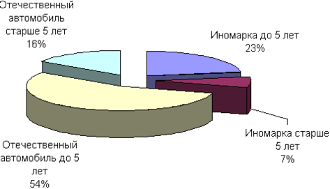 На Москву и Санкт-Петербург приходится 15% автопарка, на города с населением более 1 млн. человек – 25%. Малые города и села вносят незначительный вклад в формирование автопарка. Иномарки до 5 лет равномерно распределены между городами с населением более 100 тысяч человек, а на города с населением от 50 тысяч до 100 тысяч человек приходится лишь небольшая доля новых иномарок. Можно отметить также большую долю новых иномарок в Москве и Санкт-Петербурге, а также рост доли отечественных автомобилей, особенно старше 5 лет, при снижении численности населения этого пункта. Среди автовладельцев наибольшая доля приходится на мужчин – 82%, женщины составляют сегмент в 18%. Несмотря на небольшие размеры «женского» сегмента, его характеризуют выраженные особенности - более высокая доля владения иномарками (25% против 17%) и новыми автомобилями (53% против 42%). С увеличением возраста респондентов доля иномарок снижается, а владение отечественными автомобилями, особенно старше 5 лет, увеличивается. С точки зрения основных занятий респондентов, наиболее выражено владение иномарками в группе людей, занимающихся частным бизнесом, менеджеров высшего звена, а также домохозяек (Приложение 1,2).