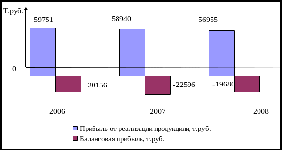 Данные свидетельствуют о том, что на протяжении рассматриваемого периода прибыль от реализации ежегодно снижается. В целом деятельность предприятия убыточна, так как балансовая прибыль со знаком минус и на протяжении 2006-2008 гг. ее значение практически не изменилось. Как видно из графика прибыль от реализации продукции приносит предприятию постоянный доход, но наблюдается тенденция спада на 1,36% в 2007 году по сравнению с 2006 годом и на 3,37% в 2008 году по сравнению с предыдущим годом. Но предприятие на протяжении рассматриваемого периода несет большие убытки от прочих видов деятельности и внереализационные расходы, поэтому балансовая прибыль со знаком минус.