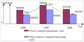 Это связано с выходом предприятия на новые рынки. В 2008 году объем выпуска по сравнению с 2006 годом снизился на 20,68% (161423 т. руб.), это связано с тем, что на складе предприятия накопилось много готовой продукции. Себестоимость товарной продукции также как объем выпуска товарной продукции в 2007 году увеличивается на 215074 т. руб. (56,51%), а в 2008 году снижается на 193278 т. руб. (32,45%).