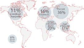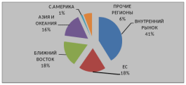 Рис.1.1. Продажи по регионам в 2008 г. (данные на основании физических объемов поставок продукции)