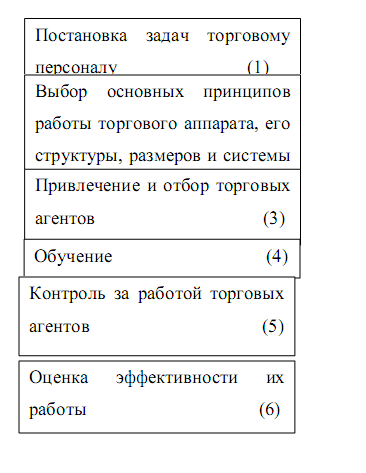 Многие специалисты несмотря на ряд преимуществ личной продажи отмечают ее недостаток - кратковременность эффекта от стимулирования сбыта путем личных продаж. [23]. В этом есть доля истины, но в сфере услуг данный недостаток носит гораздо менее выраженный характер. Эффективность личных продаж определяется в значительной степени продавцом. Поэтому фирмы тратят много времени, усилий и средств на организацию управления торговым аппаратом фирмы. Основные решения, которые фирме необходимо для этого принять, представлены на схеме, разработанной Ф. Котлером [37]